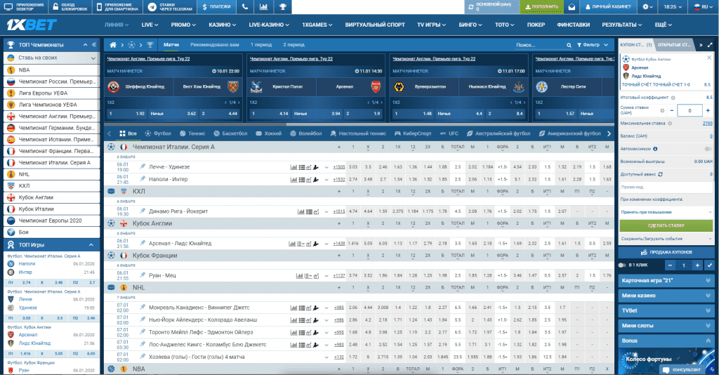 Дизайн страниц выполнен в бело-синих тонах – есть много разделов – баннеры с рекламой, акции, полезные предложения. В шапке официального сайта найдете разделы –регистрация 1xBet, выбор языка, ссылка на загрузку приложения, вход в личный кабинет. Рядом будут основные разделы — линия, LIVE, казино 1 xbet, киберспорт. Если перейдете к ставкам в левой части, то получите доступ ко всем актуальным событиям.